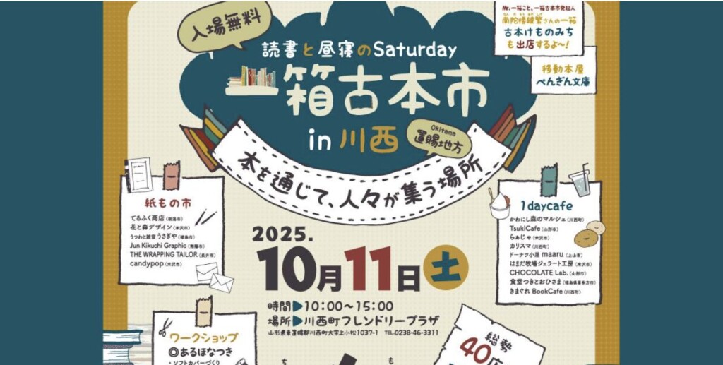 山形県東置賜郡川西町に、全国の本好きが集う特別な一日がやってきます!2025年10月11日(土)、「一箱古本市in川西2025」が、川西町フレンドリープラザにて開催されます。ダンボール一箱に詰めた個性あふれる古本を携え、全国各地から集まった一日限りの「本屋さん」たち。本と人、人と人、そして本と場所との温かい出会いが生まれるこのイベントは、まさに古本好きにとっての祭典です。