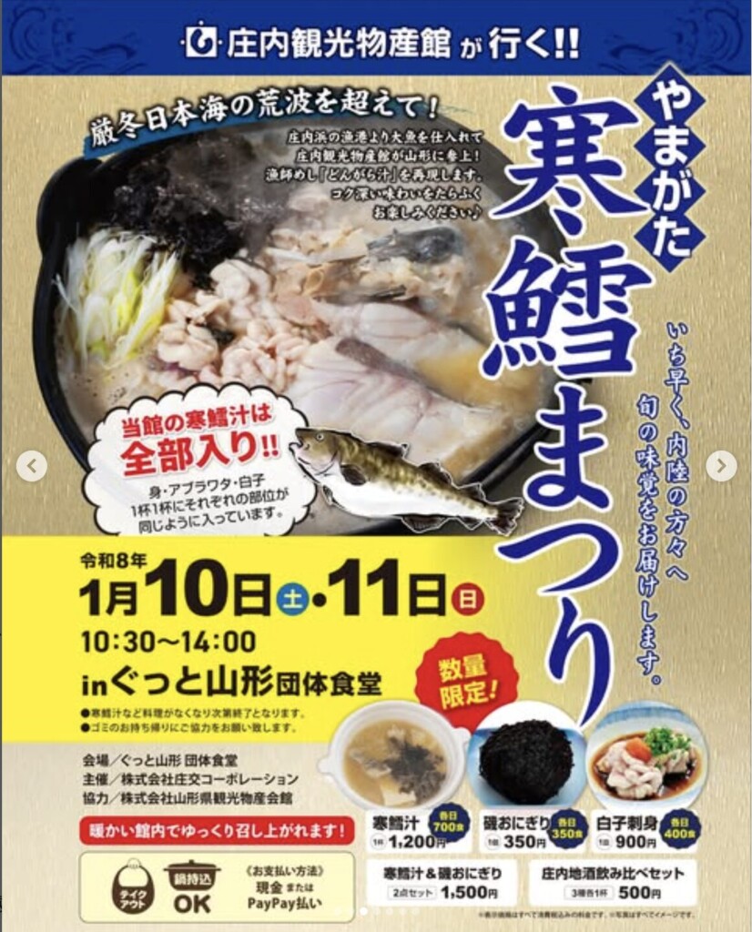 【1/10(⼟)・1/11(⽇)】庄内の冬の味覚が⼭形市へ🐟🔥